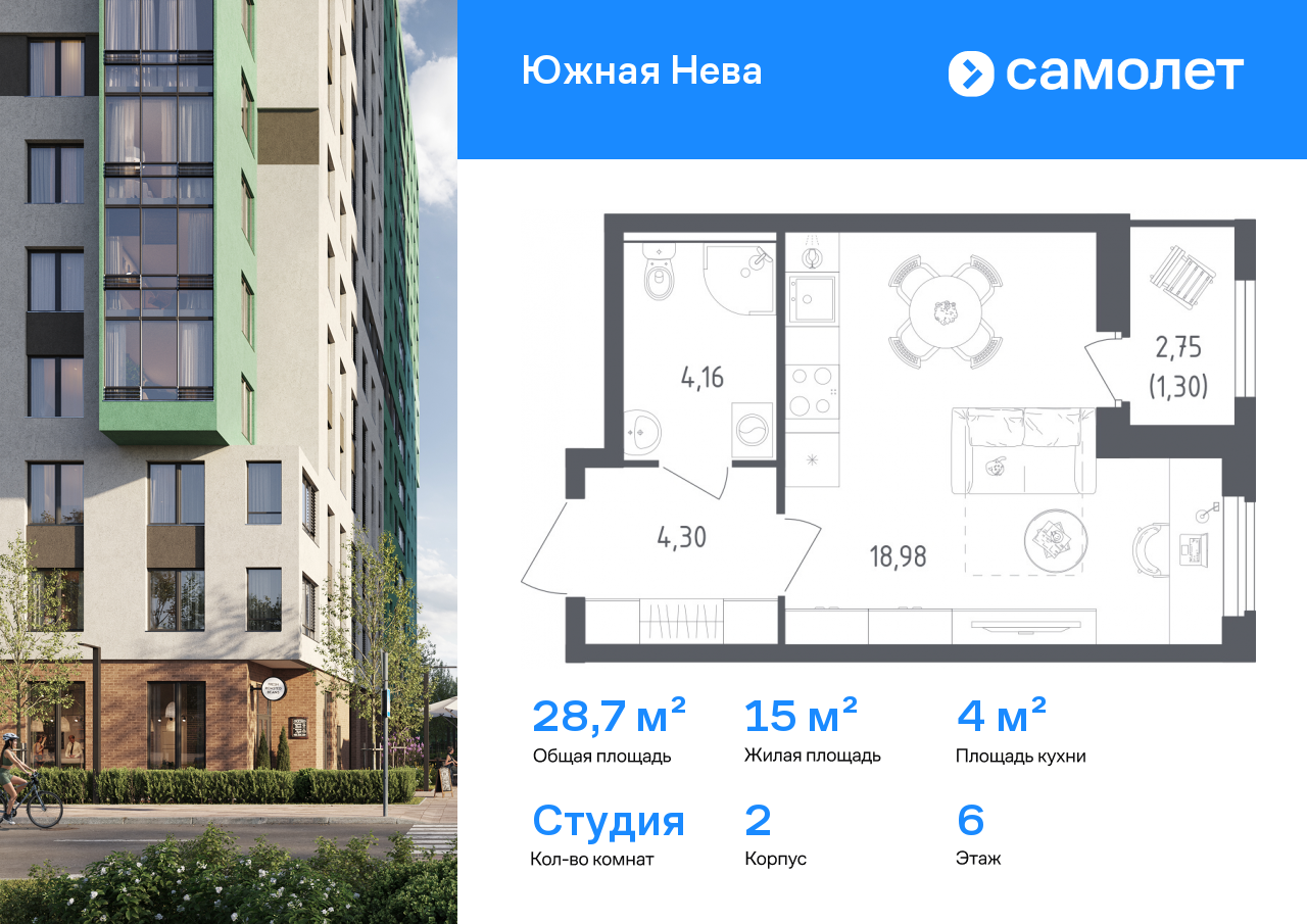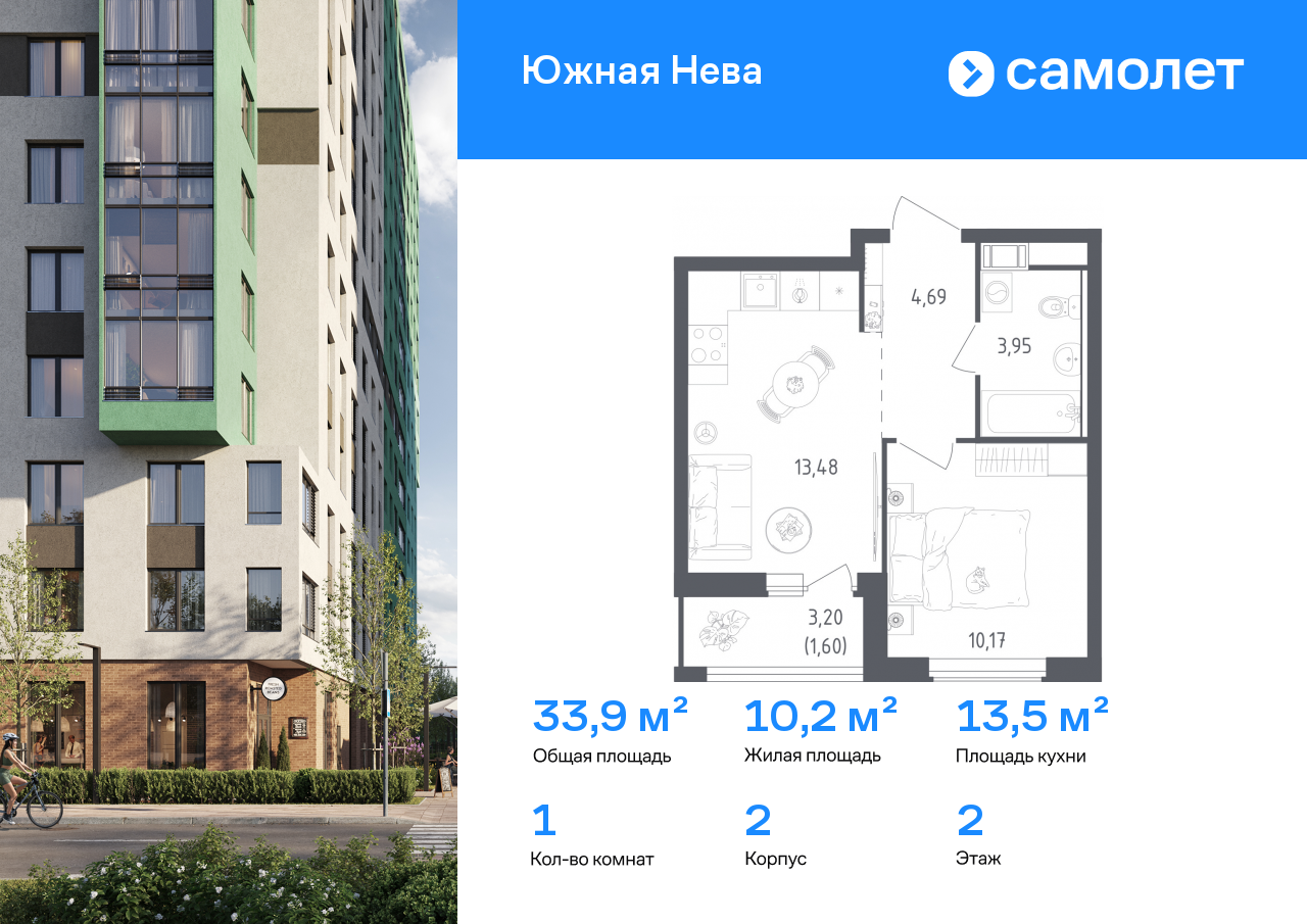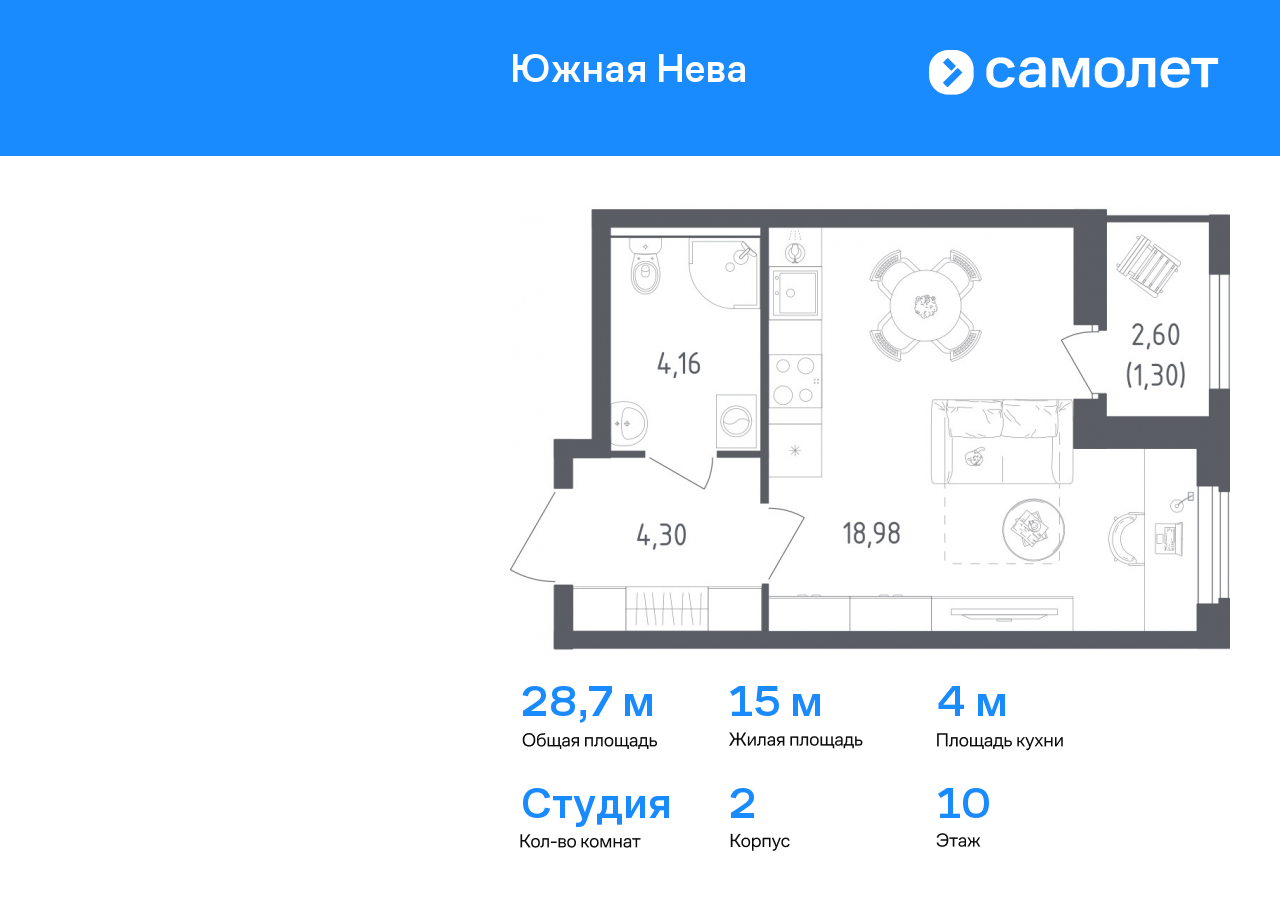 Продается 1-комн. квартира с отделкой. Квартира расположена на 12 этаже 15 этажного монолитно-кирпичного дома (Корпус 1, Секция 1) в ЖК «Южная Нева» от группы «Самолет».
