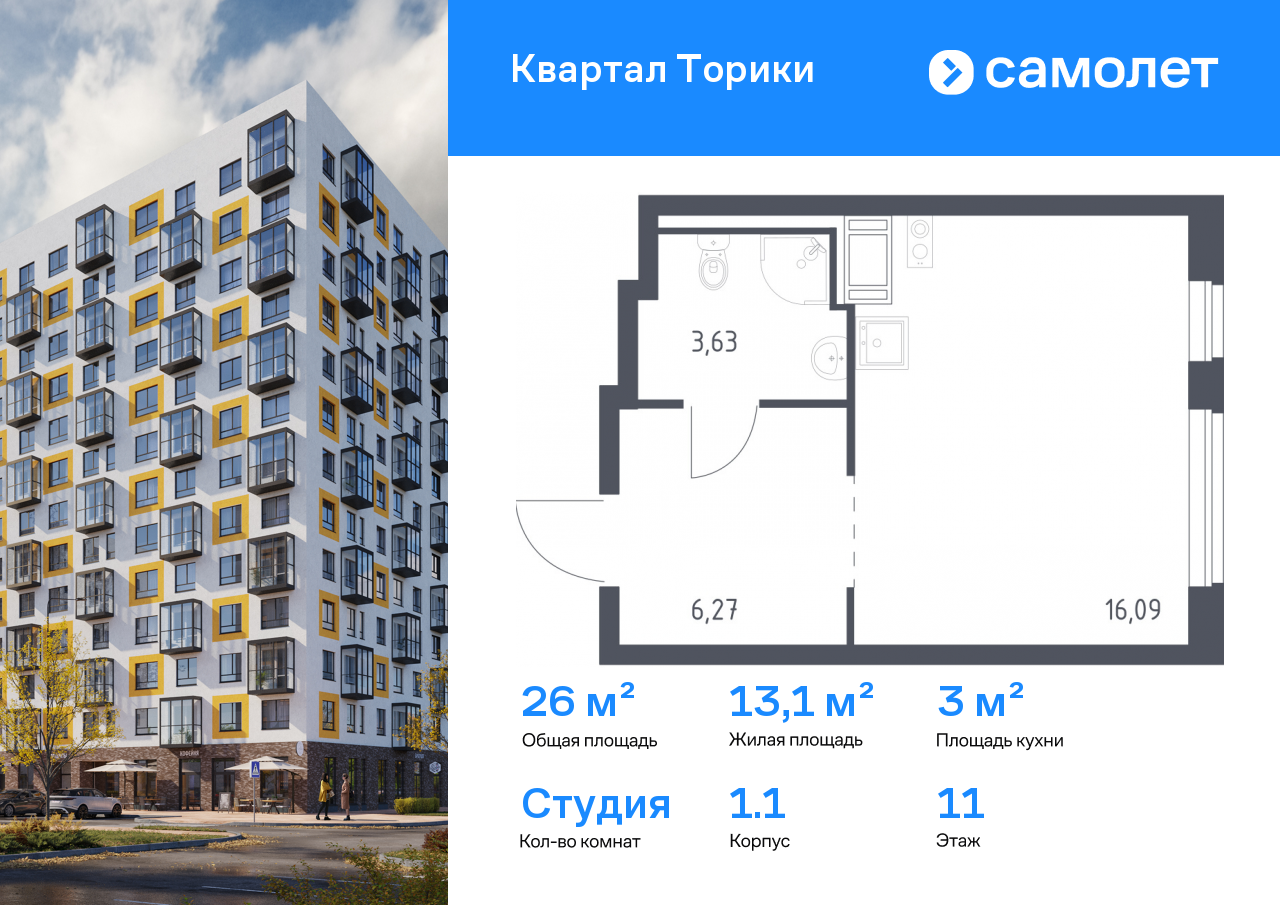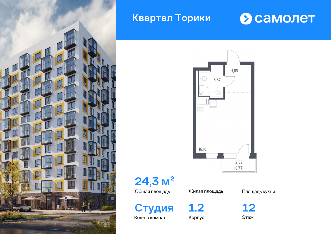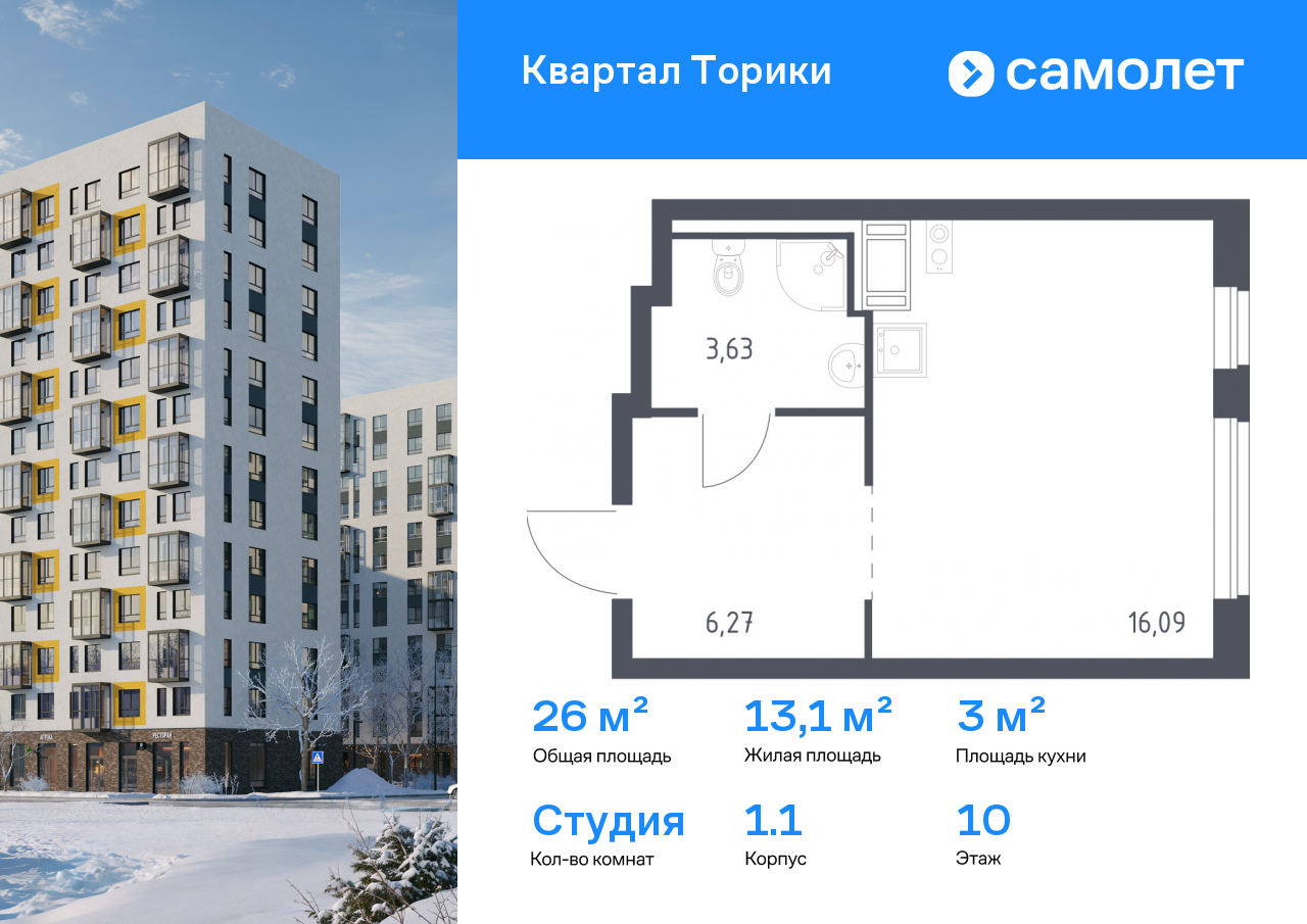 Продается квартира студия площадью 25,99 кв.м на 10 этаже 13 этажного дома в ЖК «Квартал Торики» от Группы «Самолет». «Квартал Торики» - это семейный жилой комплекс с собственной социальной инфраструктурой, расположенный в Ломоносовском районе Ленинградской области.