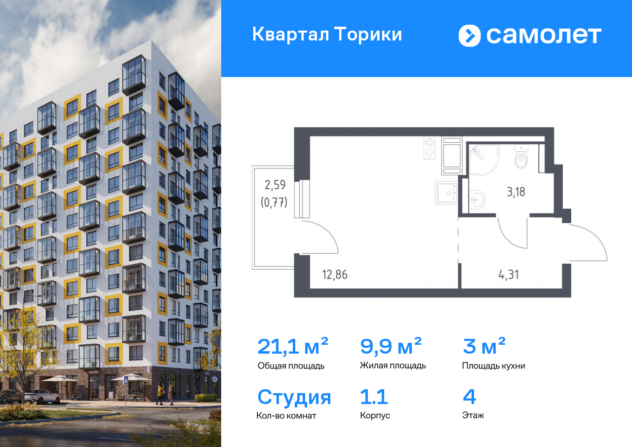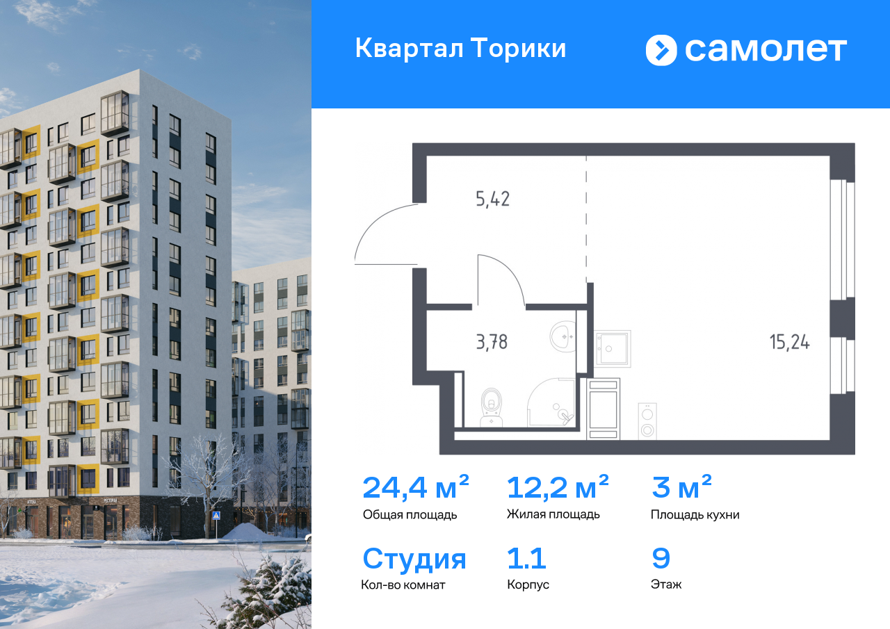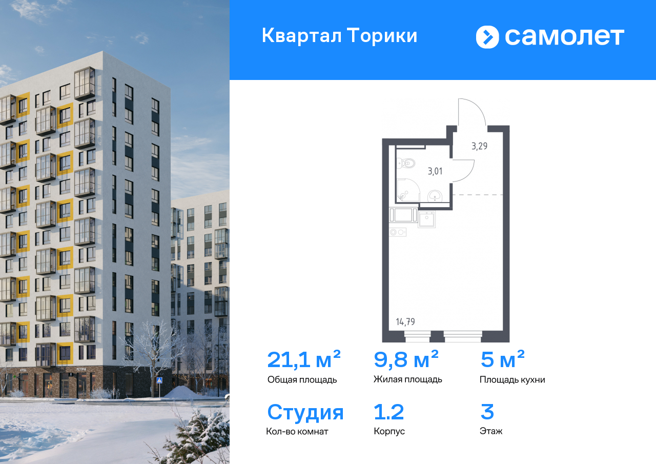 Продается квартира студия площадью 25,99 кв.м на 10 этаже 13 этажного дома в ЖК «Квартал Торики» от Группы «Самолет». «Квартал Торики» - это семейный жилой комплекс с собственной социальной инфраструктурой, расположенный в Ломоносовском районе Ленинградской области.